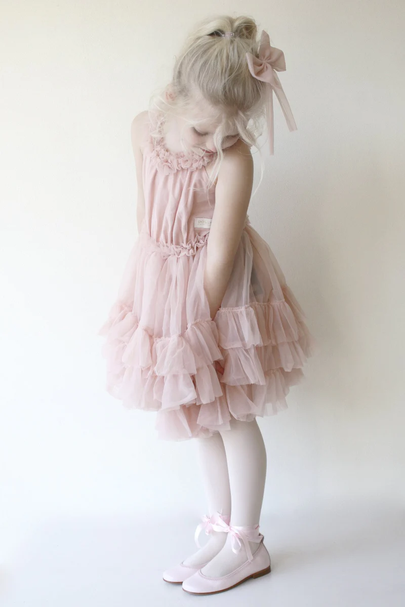 Velkommen inn i en eventyrverden for små og store prinsesser! Ruffled Chiffon Dance dress fra Dolly By Le Petit Tom i den nydeligste nylonchiffong med volanger og god stretch. Ballerinasko fra DOLLY ballerinas passer perfekt til kjolen. 100% Nylon Chiffon 30 grader finvask.