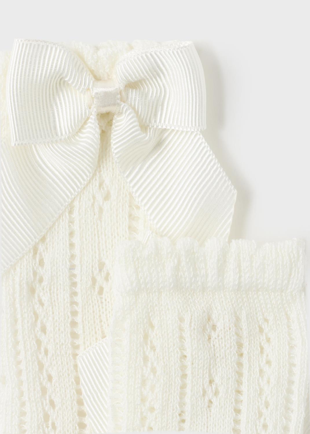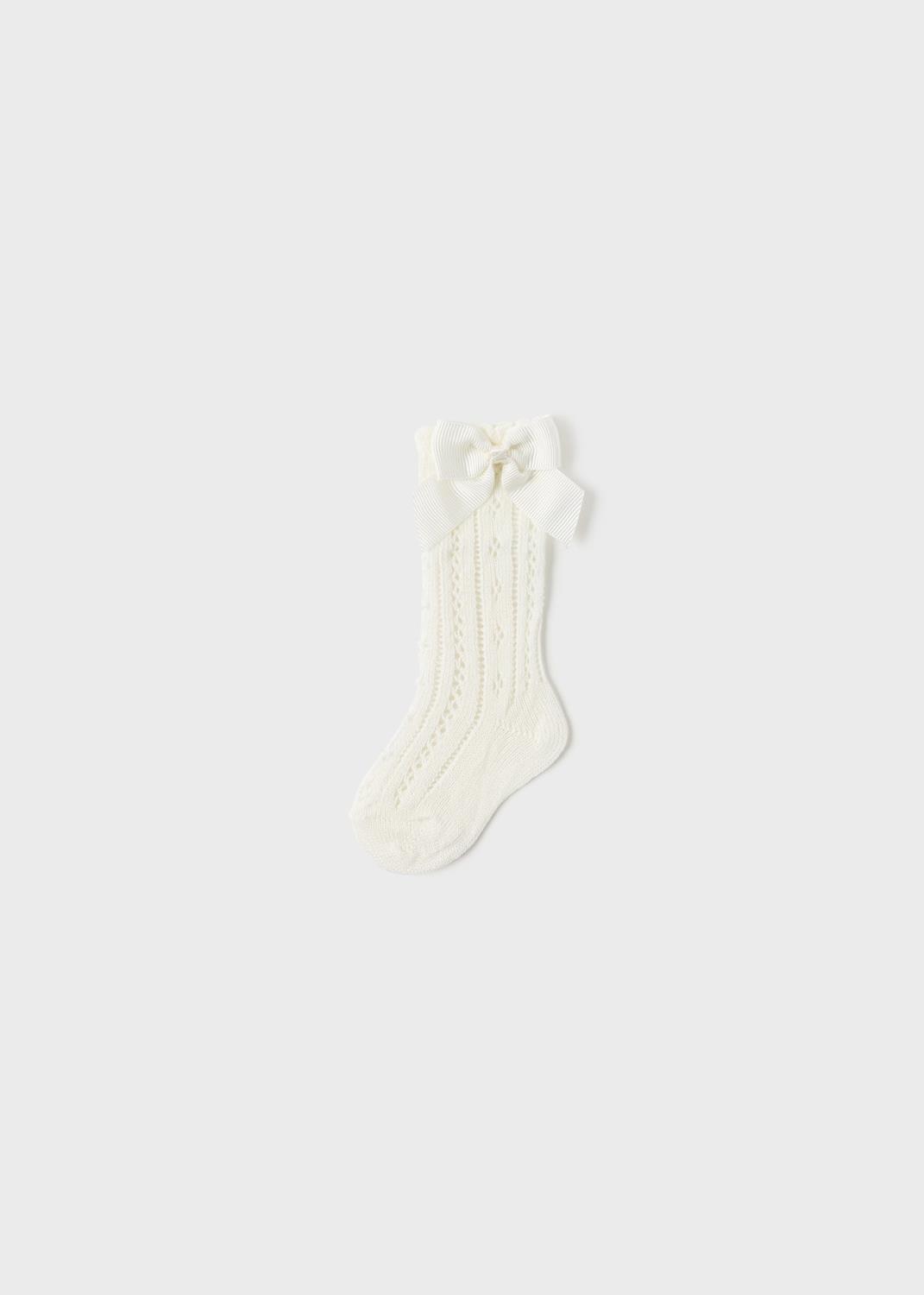Supersøte knestrømper til de minste jentene fra Mayoral i nydelig mønster og pyntesløyfe. Mayoral er små i størrelsen. 80% Bomull og 20% Polyamide. 30 grader maskinvask.