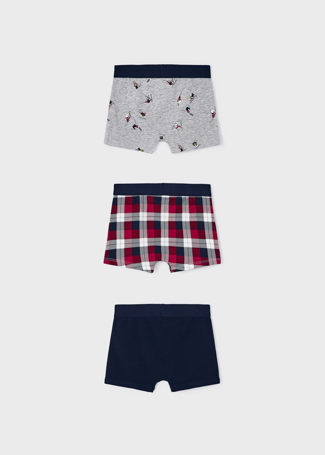 Boxershorts til gutt fra Mayoral, 3 pk. i myk bomullskvalitet med god stretch i tre ulike design. Mayoral er små i størrelsen. 57% Bomull, 27% Polyester, 13% Viscose, 3% Elastane. 40 grader maskinvask.