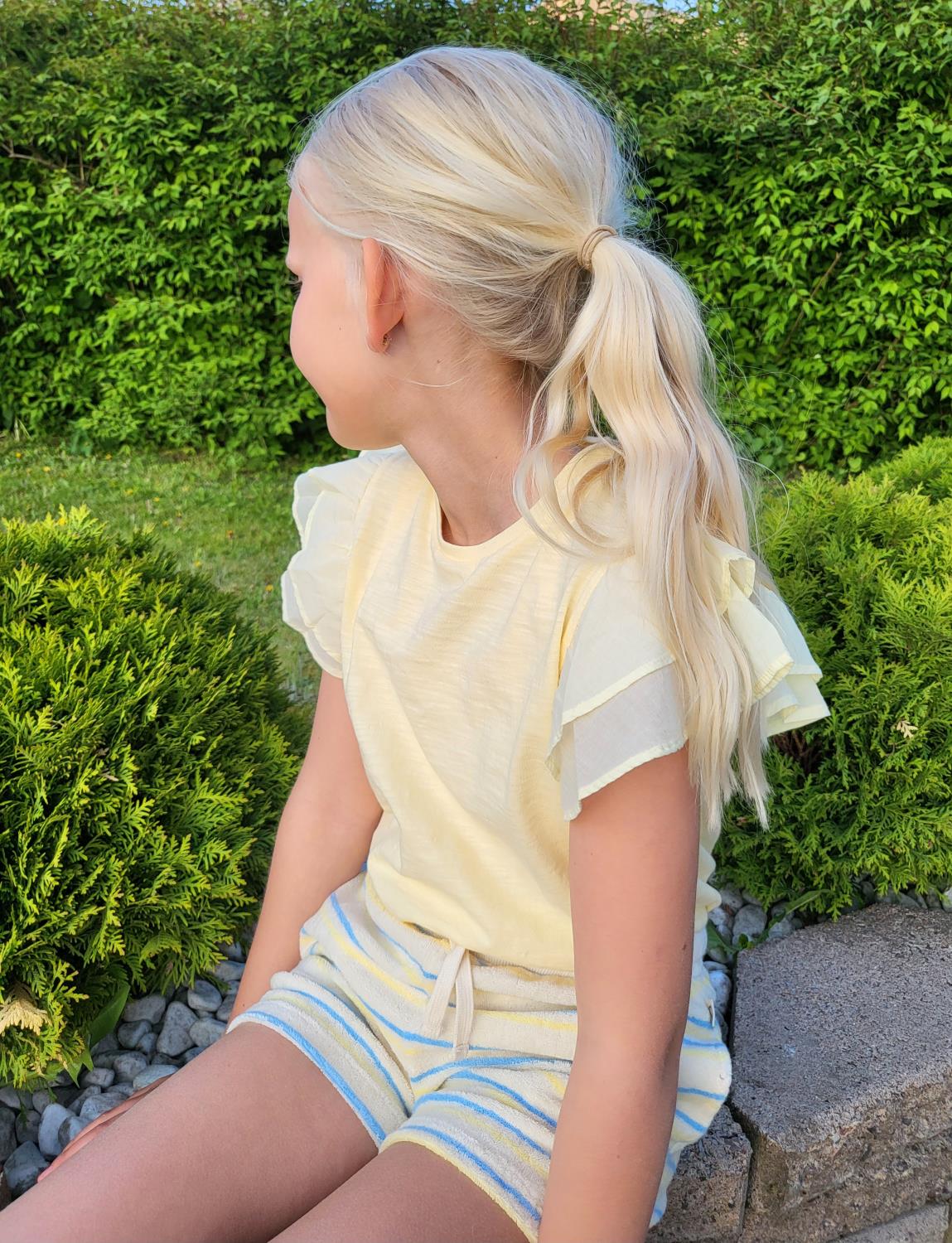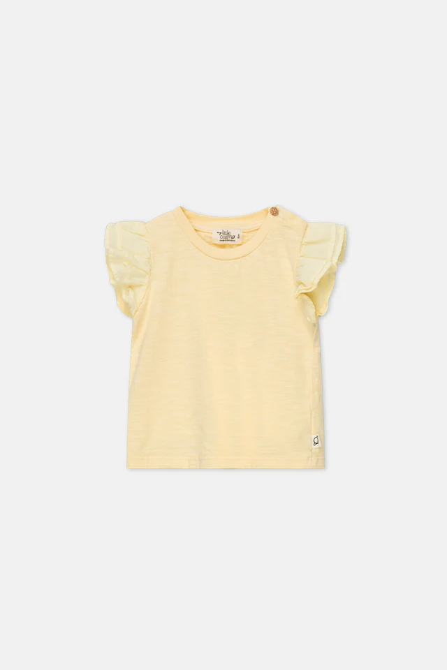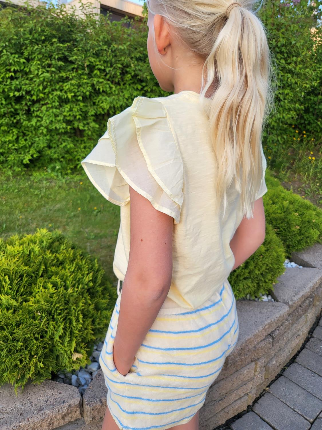 Bluse til jente, fra My Little Cozmo, i en nydelig, myk, økologisk bomullskvalitet med søte rysjer på skuldre. Cozmo er litt små i størrelsen. 100% Økoligisk bomull. 30 grader maskinvask. Laget i Barcelona.