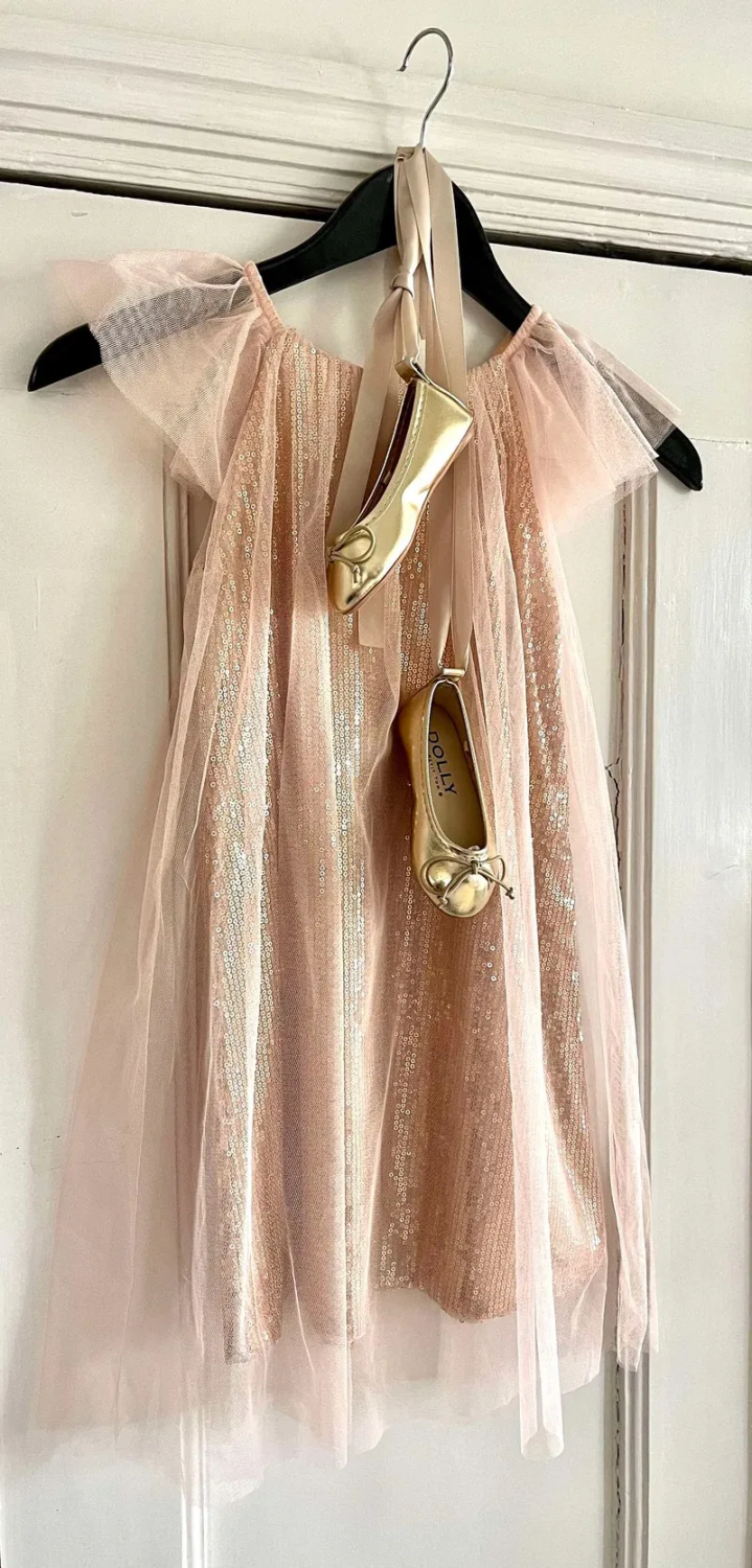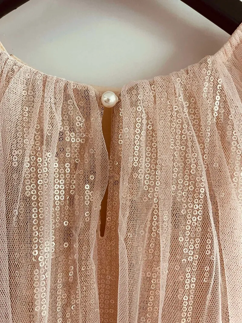 Velkommen inn i en eventyrverden for små og store prinsesser! Lekker paljettkjole med tylloverlag fra Dolly By Le Petit Tom, A-linjeformet design med korte ermer og med knappelukking bak i nakken, Håndvask