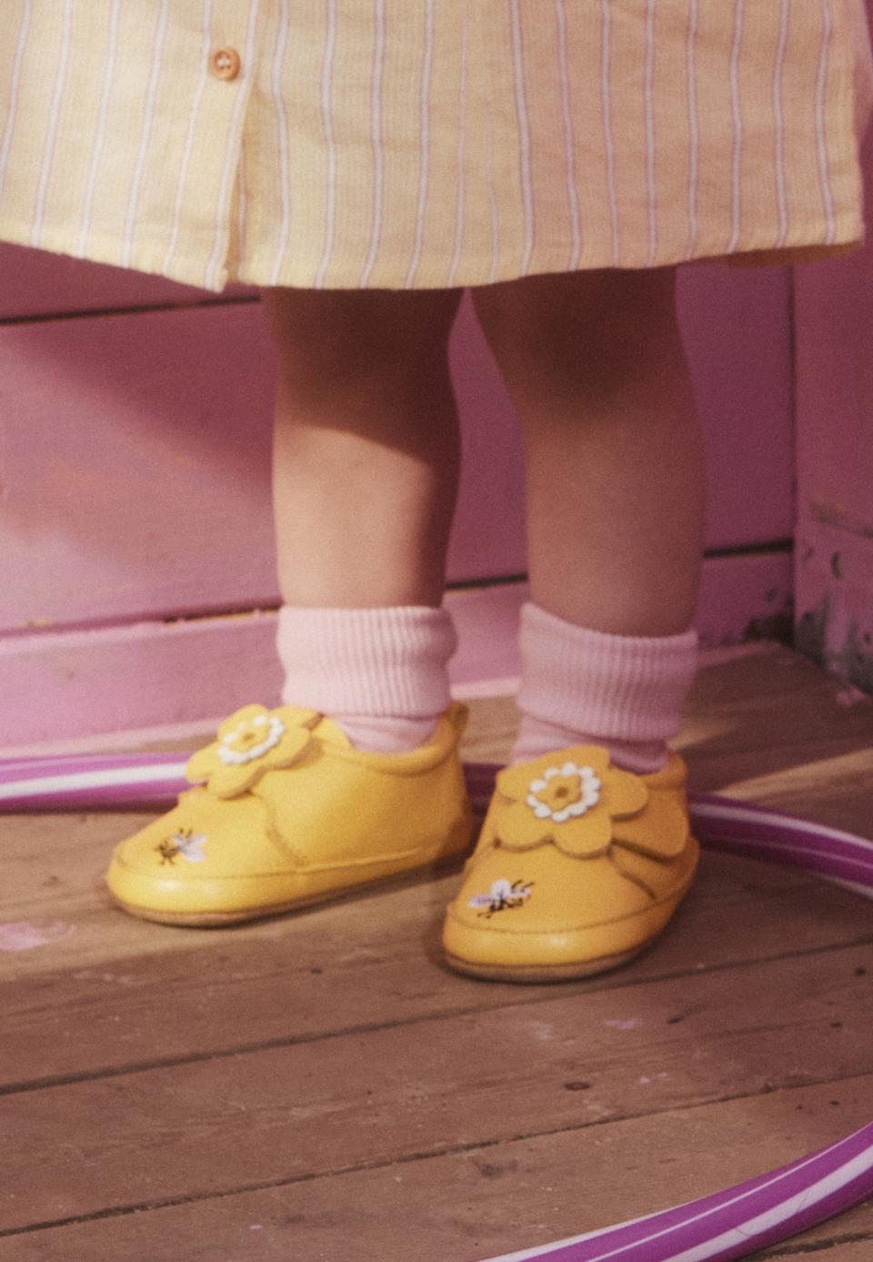 Nydelige skinntøfler fra Melton. Tøflene er foret med 100% bomull og er dekorert med en nydelig brodert bie og blomst. De er myke og fleksible, noe som sikrer at føttene kan bevege seg fritt. Innersålene er uttakbare. 100% skinn. Fôr: 100% bomull. Såle: 100% skinn.